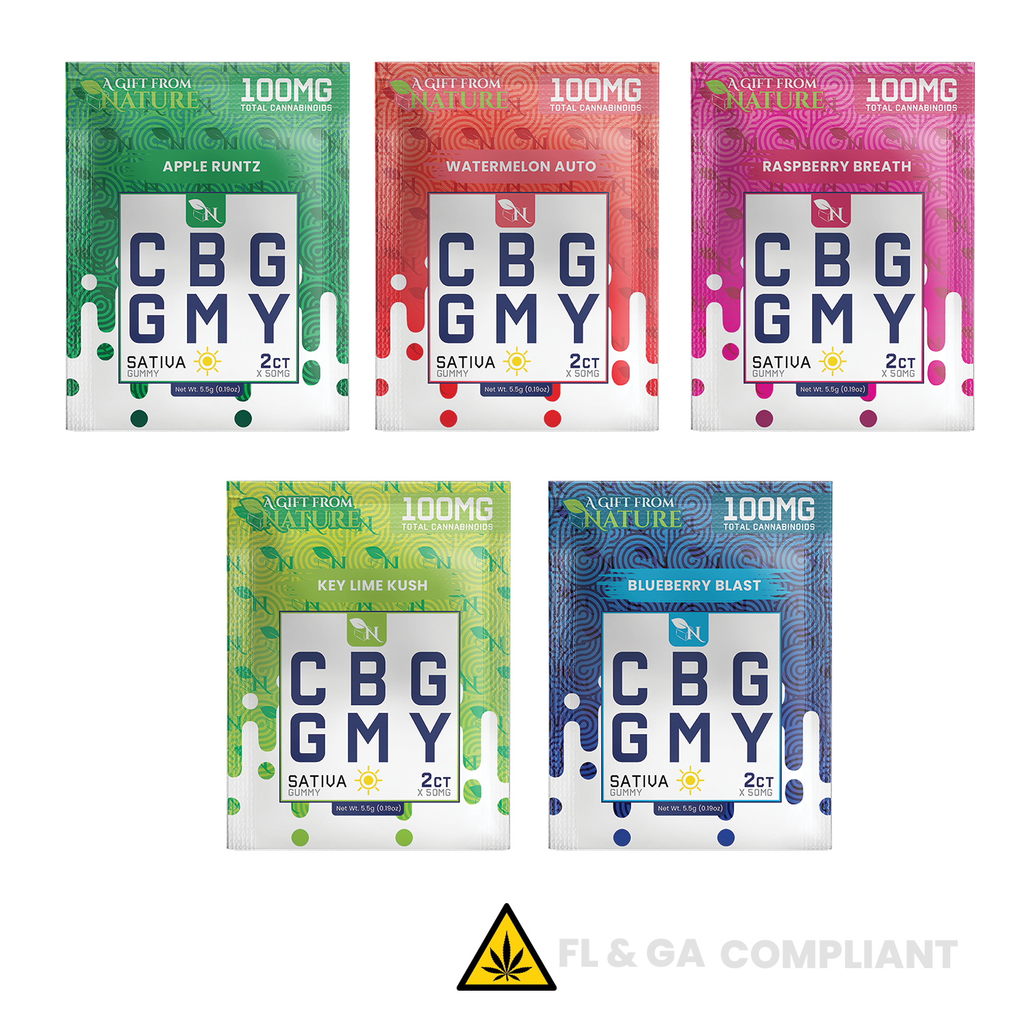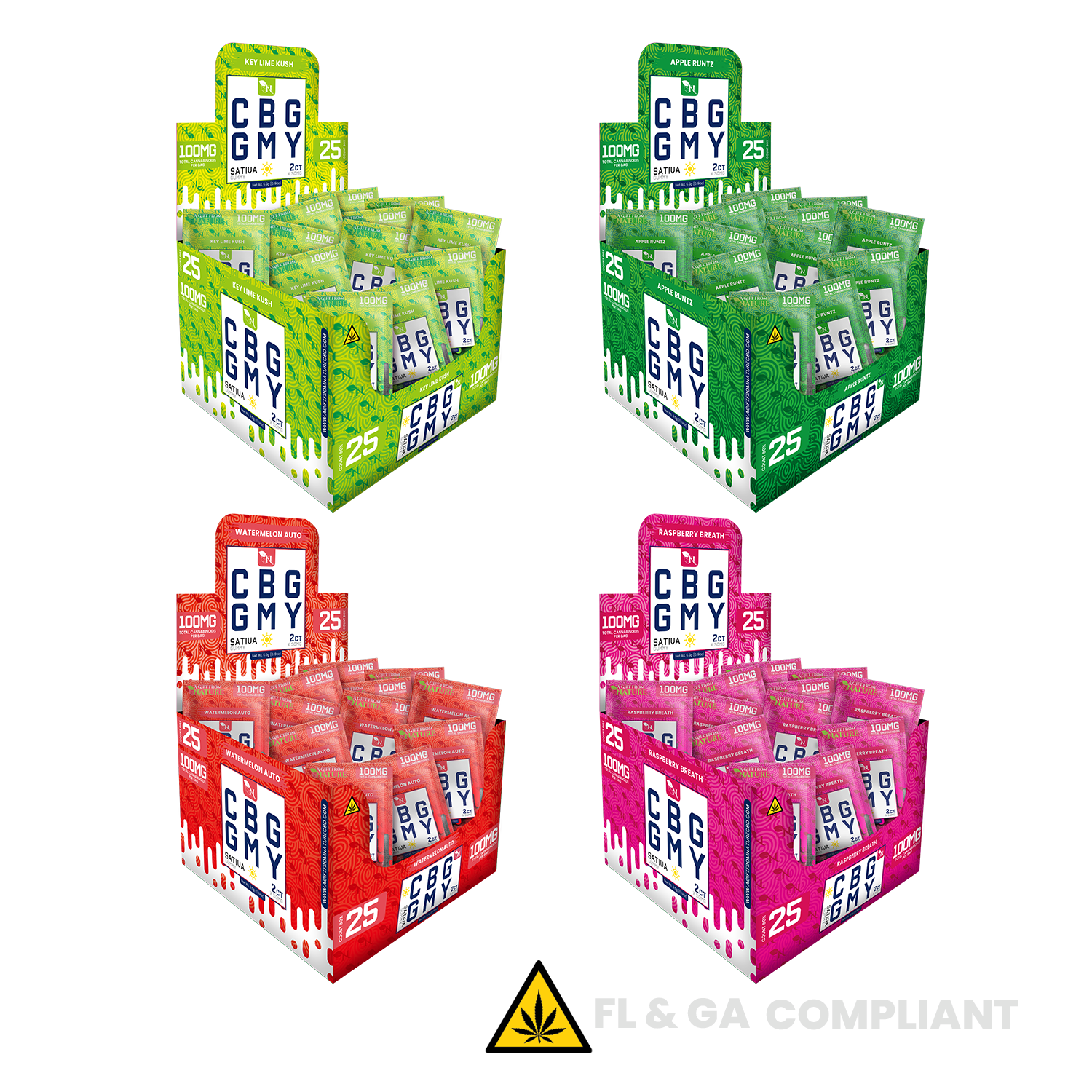 25 - 2ct gummy packs per box - Premium hemp-derived gummies infused with 1500mg of CBG (50mg per gummy).