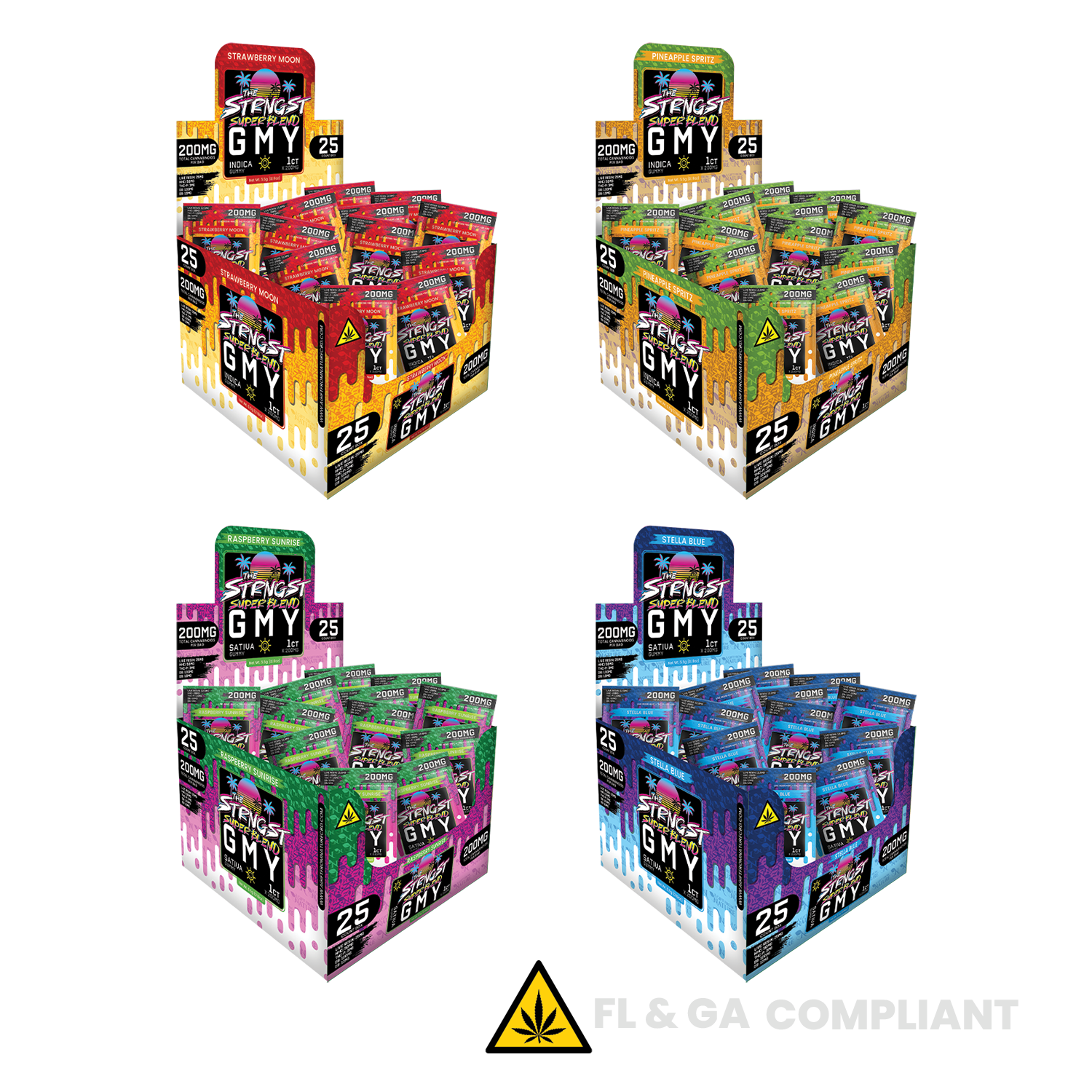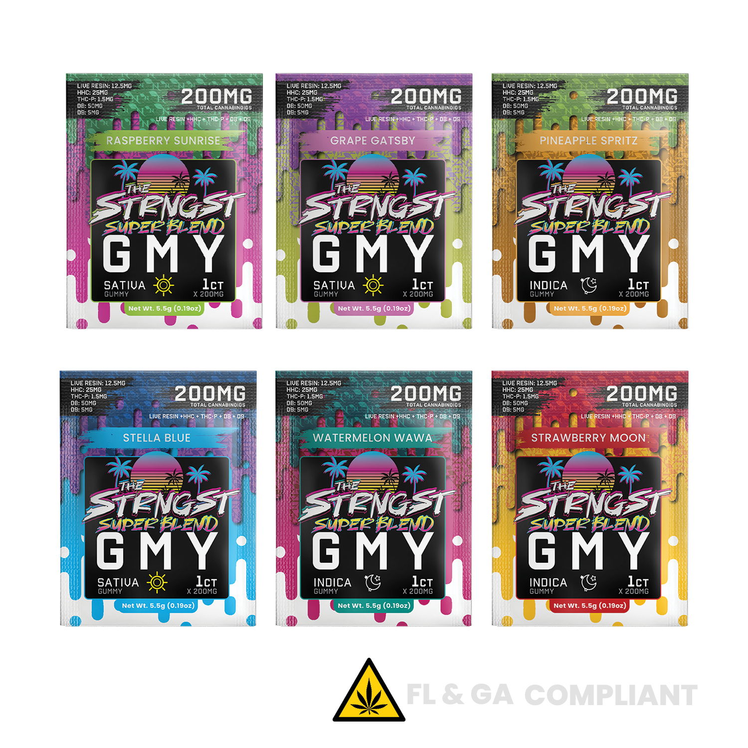 25 single pack gummies per box - Premium hemp-derived gummies infused with our super blend of 300mg of Delta 9 (10mg per gummy), 3000mg of Delta 8 (100mg per gummy), 750mg of Live Resin Full Spectrum (25mg per gummy), 1500mg of HHC (50mg per gummy), 210mg of CBD (7mg per gummy) and 90mg of THC-P (3mg per gummy), equating to 200mg per gummy. Rated the strongest gummy in the market, we strongly recommend each gummy as 2 servings.